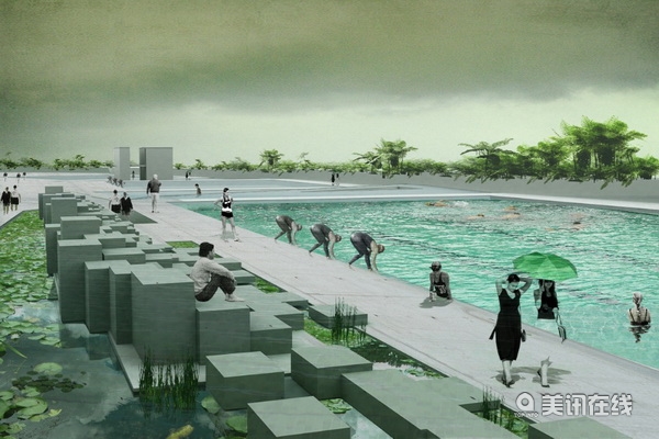 這個水上建筑與周圍的環境鏈接融合在一起。在夏天為人們提供一個游泳的去處,同時這里還是一個充滿生機的生態系統,各種植物和水流相互影響,如同一個天然濕地