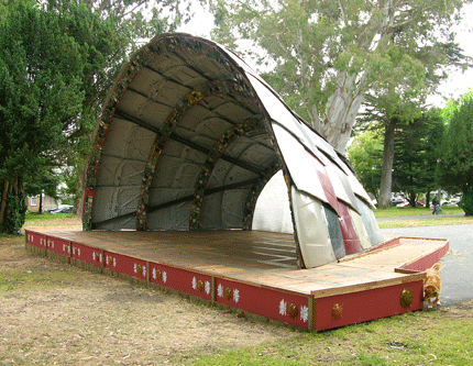 鍋柄音樂臺是一個全尺度的表演舞臺,全部由回收材料以一定模數建造而成。對于材料成功的創意翻新利用和作為公共活動場地的成功使這個音樂臺成為了藝術家,建筑師,環境支持者和社區工作人員的典范。這個音樂臺也從某種程度上挑戰了管理當代公共空間的政治停滯,并提出了為誰,為什么服務的問題。