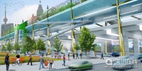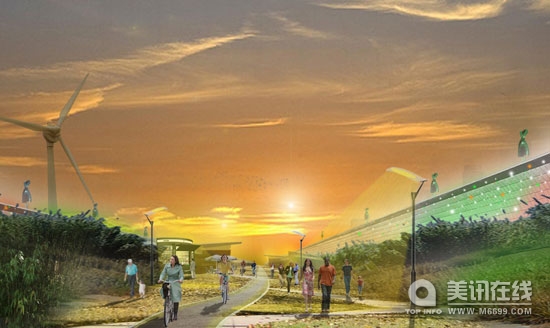 這條線性的“綠帶公園”內將設置步行道和自行車道,公園入口設置在主要的交叉路口,那里會設有斜坡和樓梯。另外,設計師還設想在這個“綠帶公園”中安裝風力渦輪機和光電板,這樣可以為道路供電。