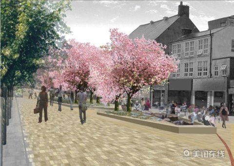 Landscape Projects公司的獲勝作品是把阿克寧頓市表達(dá)成一個花卉市場的小鎮(zhèn),并建議在臨近的市場和市政大廳建造一個露天場所。設(shè)計小組的想法中包括植樹,提供座椅以及一個引人注目的鐵制弧形建筑,用來述說城市的故事。