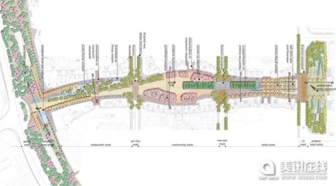 步行街的景觀設(shè)計(jì)中融入了現(xiàn)代元素和法國(guó)古典風(fēng)格。高大的銀杏樹沿著商店前的街道排成一排,讓住宅大廈自然地過(guò)渡到街道花園;四季常青的樟樹和城市的硬邊環(huán)境形成鮮明的對(duì)比,這些樹組成了一個(gè)全年的迎客“天篷”;而每年落的櫻樹能讓你欣賞四季不同的景色。為了能刺激人們的各種感覺(jué),景觀設(shè)計(jì)師在設(shè)計(jì)中也采用了一些芬香植物,如桂花樹,細(xì)小的黃色花朵能散發(fā)出成熟桃子和杏子的香味。