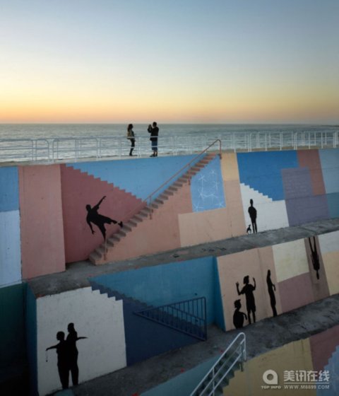畫中使用的藍色代表了天空和大海。這種顏色能夠真正意思上的“突破防波堤形式的束縛”。設計師希望讓這幅畫能給人帶來一種新的感覺,于是他們決定在畫上增加一些人影。這樣,設計師成功地讓這幅巨大的畫充滿了生機。