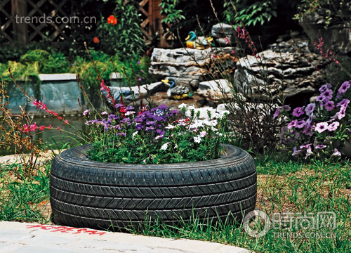 主人設計了這樣一個輪胎花壇,真是巧妙的設計。