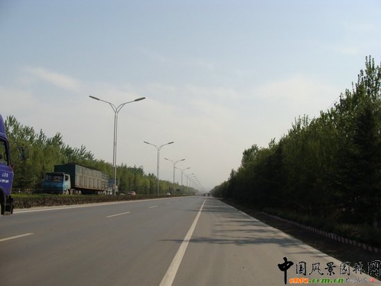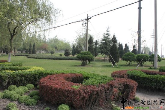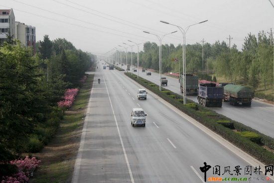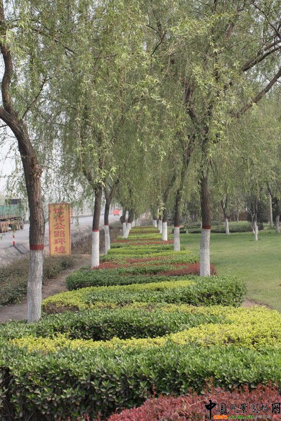西環路北起北環路,南至南環路,建于2000年,道路總長3km、寬70m,公路綠化為二板三帶式,綠化面積為8.65公頃,中間分車帶種植草坪及金女貞和造型花壇,在不同的季節種植花,春有虞美人,夏植菊花、小麗花等,道路兩旁綠地以豐花月季和百日紅交替種植,開花季節,整條道路姹紫嫣紅、分外迷人。同時,綠帶旁種植有四行樹,以雪、毛白楊、垂柳等大型喬木為主,同時,栽植紫穗槐形成高低交錯層次分明的美化經化效果,使整體路段滿目青翠,花團錦簇,賞心悅目。