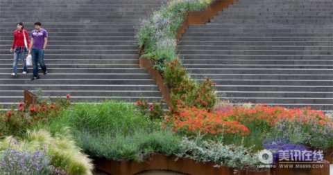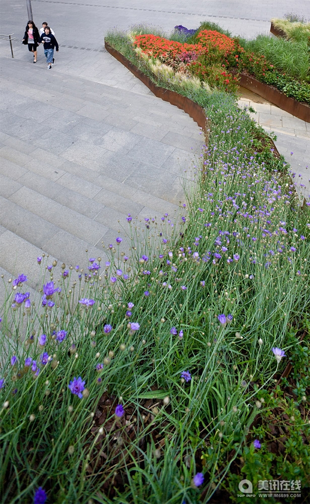 以下是Balmori Associates對于該工程的描述:這個花園沿著臺階向上攀升,形成了不同顏色不同形狀的曲線。它是一個動態的城市空間,隨著時間以及季節的變化而不同。繁盛的植物像瀑布一樣傾瀉下來,賦予了花園一種流動的感覺。花園擴大了公共空間,增加了設計風格的多樣性,它改變了行人對于臺階和空間的感受。這是一個對比性的花園,對比存在于本地植物和外來植物之間,紅色花和綠色之間,以及綠色草和灰色路面之間。從形狀上來說,花園將水平的廣場和豎直的臺階結合了起來。就像羅馬著名的西班牙臺階一樣,這個花園不僅是為上下臺階的游客所設計,也是為逗留玩耍的行人所設計的。