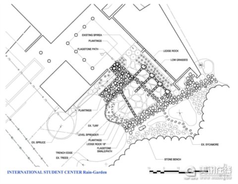 國際學生中心雨花園通過揭示景觀設計如何收集屋頂和表面的雨水,向學生、教職員工、管理者和校園訪客展示了低強度的雨水管理解決方法。從策略上來說,雨花園解決了一個非常重要的問題,它將自然雨水管理系統加入到了城市的結構中,換句話說,它彌補了公眾缺乏的知識,通過將藝術、建筑設計、生態、水文和人文科學結合起來,使人們認識到了這些系統的功能和設計概念。