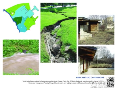 烏龜為生存而做出努力,基礎設施破壞了校園小溪。ISC雨花園所在地是在2006年秋季雨水管理規劃/設計研討會上發現的,現在這個地方正在創造一種不同的更有意義的校園。