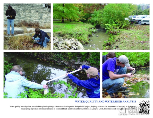 水質量調查繼續著手對規劃/設計的討論和雨花園的設計建造工程,加強了設計和校園小溪中泥沙量以及排泄物污染重要相關信息分析的重要性。2008年做了滲透測試。
