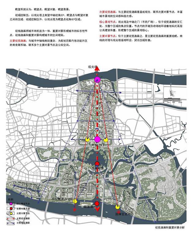 在規劃中確定的中軸觀光區,消費商業區,湖濱行政區,文化娛樂區,創意灣,國際灣,休閑灣,中央濕地等7大城市核心功能分區及其周邊居住社區,構建起活力中軸線的多元城市功能布局。