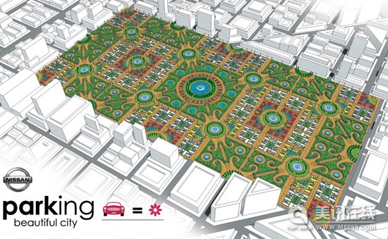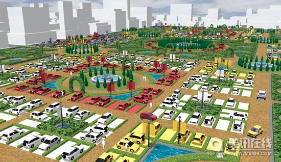 “城市花朵”是一個城市公共區域,它的設計概念是將每一輛車比作一朵城市之花。每一輛車都有自己的獨特的形狀及顏色,這一點同花朵類似。因此,在這個停車場中,車主根據車的顏色來確定停車的位置。最終,停車場就會像一個多彩的凡爾賽花園。每個停車區周圍的綠色區域使停車場更具有活力。這個作品將車輛作為整個城市綜合體的一部分,并使它成為了一種城市象征性的裝飾性元素。