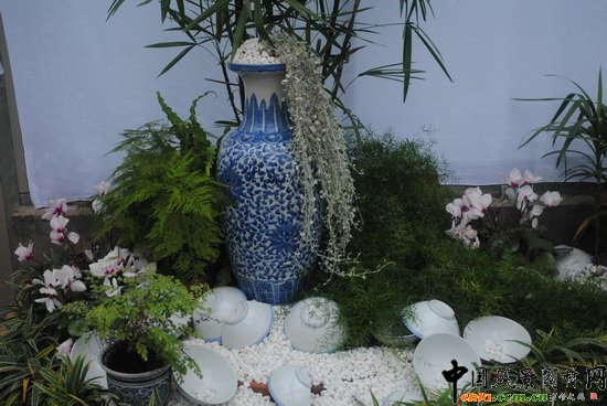 青花瓷瓶上細(xì)軟、嬌秀的蔓莖從容下垂;純潔、平和的仙客來(lái)靜靜開放;平整、鮮嫩的翠云綠意盎然;拼合瓷碗中匍匐、蔓生的綠蘿流溢而出;中國(guó)含蓄、質(zhì)樸的審美情結(jié)從場(chǎng)地的殘缺美中蔓延而去...