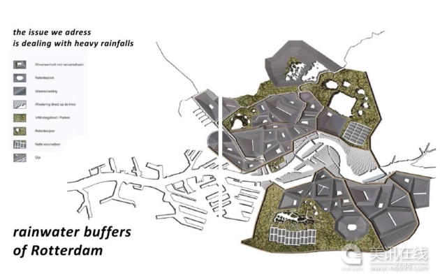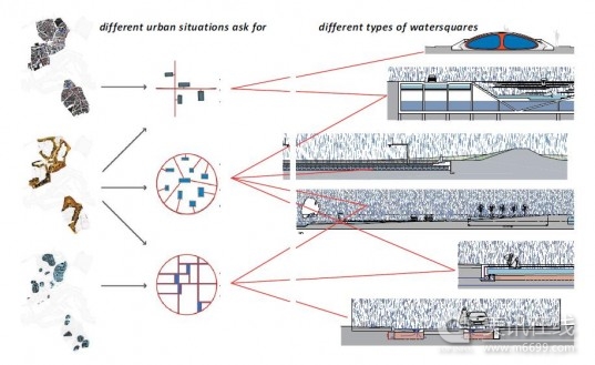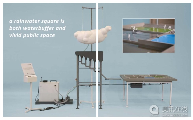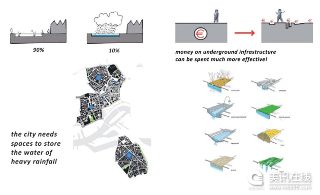荷蘭De Urbanisten公司的Watersquare設計方案為易遭洪水危害的城市提供了一個新的解決方案。De Urbanisten公司的方案作為鹿特丹防水方案之一,其是鹿特丹市尋求管理和控制水城市政策的一部分,將街區中的雨水收集到一個水廣場之中,這個廣場可以作為人們聚會、玩耍、運動的場所。