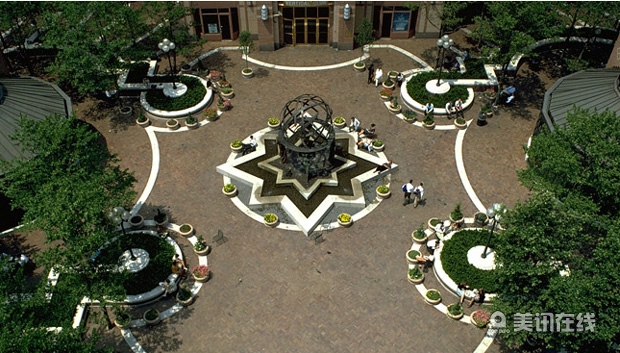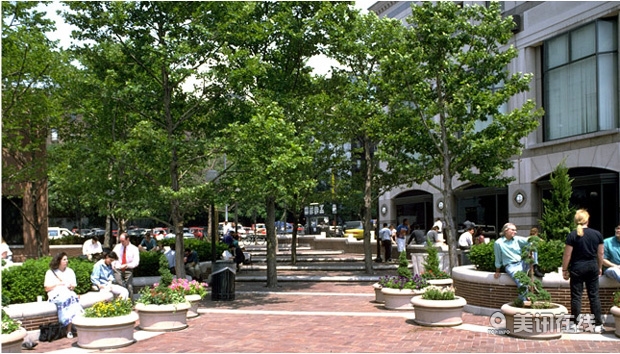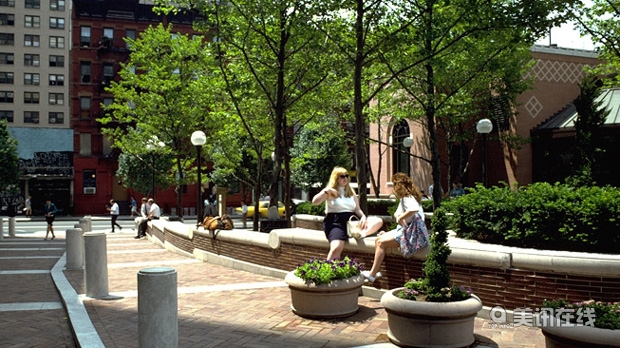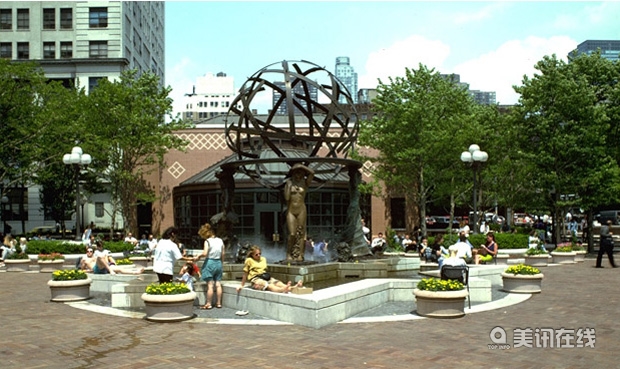 SWA公司受邀參與一個廣場設計項目,在一英畝大小的廣場上完成園林景觀設計,該廣場位于曼哈頓商業區西部的再發展地區上。整個項目包括一座占地150萬英尺的49層辦公樓和有300個單元的38層住宅樓。建筑師設計的辦公大樓能讓人聯想到20世紀20年代紐約市的經典摩天大樓。