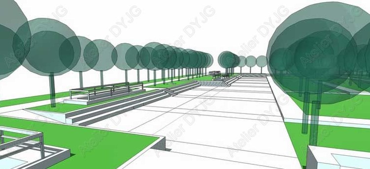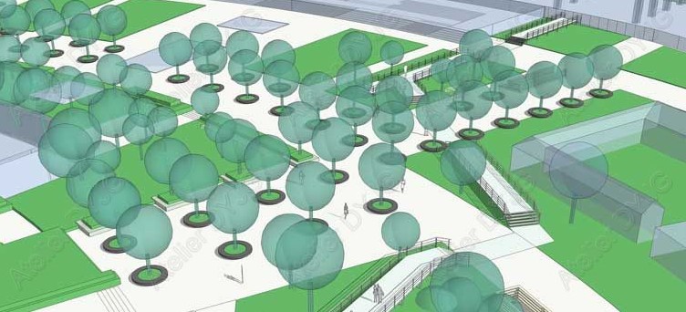 12#地塊用理性的簡潔的形式使景觀與周圍建筑相融和,下沉式的布置又使空間在簡潔的同時又富有變化。康體中心前的廣場為人流提供了集散的場所,同時為各種活動提供一個舞臺。北部的楊樹林使廣場與街道有所分隔,整齊高聳的樹形又與背后高大的建筑相協(xié)調(diào)。層層上升的地平臺提供了尺度宜人的休息空間。