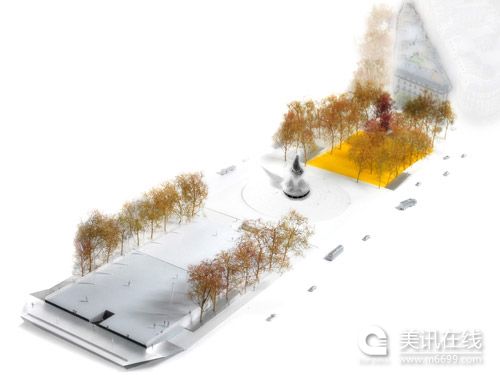 2.2 中心紀念碑,位于廣場的中心,看起來像是人流中的一座小島。我們提議為廣場修建一個地基建筑,這個建筑略略傾斜,形成一種火山式的結構。行人可以繞著紀念碑走,也可以在紀念碑的影子下歇息。