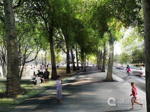 2.3 散步道,這里是三叉口處:Voltaire大街、共和廣場、du Temple大街。我們在這里修建了一個巨大的石質散步道,傾斜率為2.5%。傾斜角度使得其在最遠端處,自然而然地高于機動車道(大約高2米)。