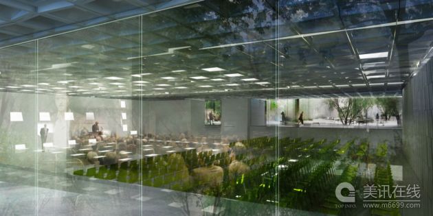 整個樓群的低地基與幾排大樓全部為開放式布局,可以毫無阻礙的觀賞到后面的山丘景色。從大樓的地基處遠望這個花園,可以看到一個充滿活力與激情的工作社區,這里又各種各樣的辦公室與會議室,新址將可以容納1200多間辦公室。與目前總部大樓的有色玻璃窗不同的是,新的國際刑事法庭總部將顯得更加開闊和透明。