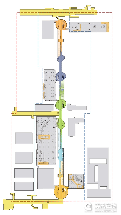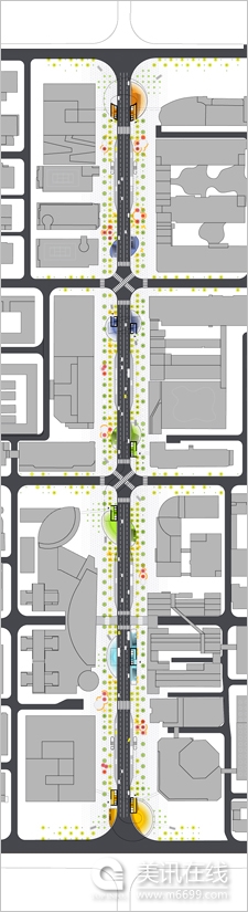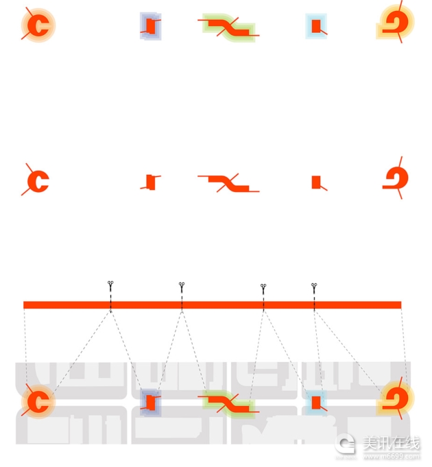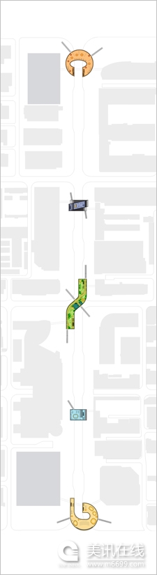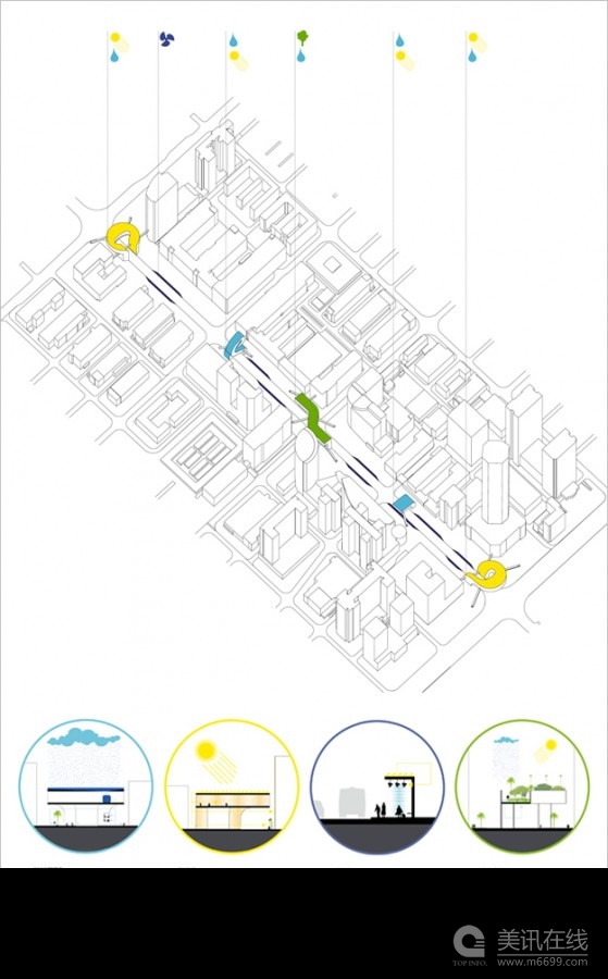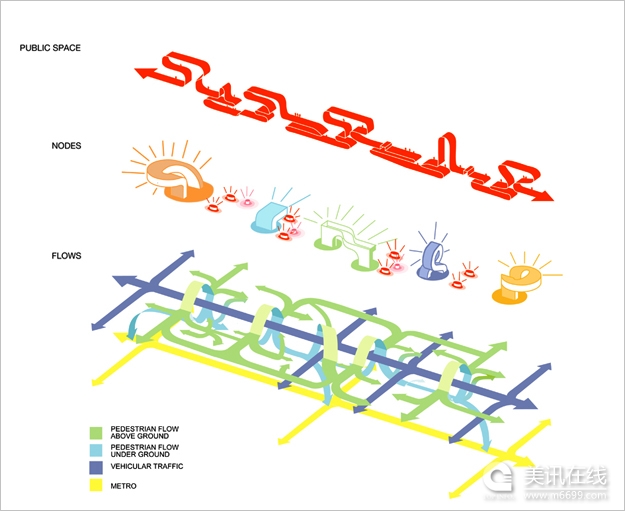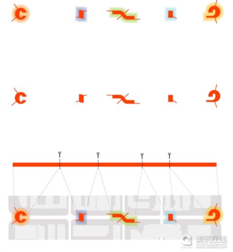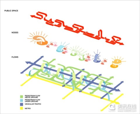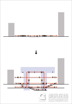 WORKac建筑事務所方案將五個過街節點放大夸張成五個燈籠型的標志建筑跨騎在道路中間。設計師說。“我們做方案時并不刻意強調視覺美學,而是游離于形式之外,反而重視空間對生活的影響,關注兩者之間的關系。建筑就像機器,既可以容納、也可以制造人的生活。以平民化的視角去關注生活、關注社會運作以及建筑能為社會生活提供什么樣的空間形式,反對英雄主義或者尖叫的建筑,這是我們一貫的價值觀。”