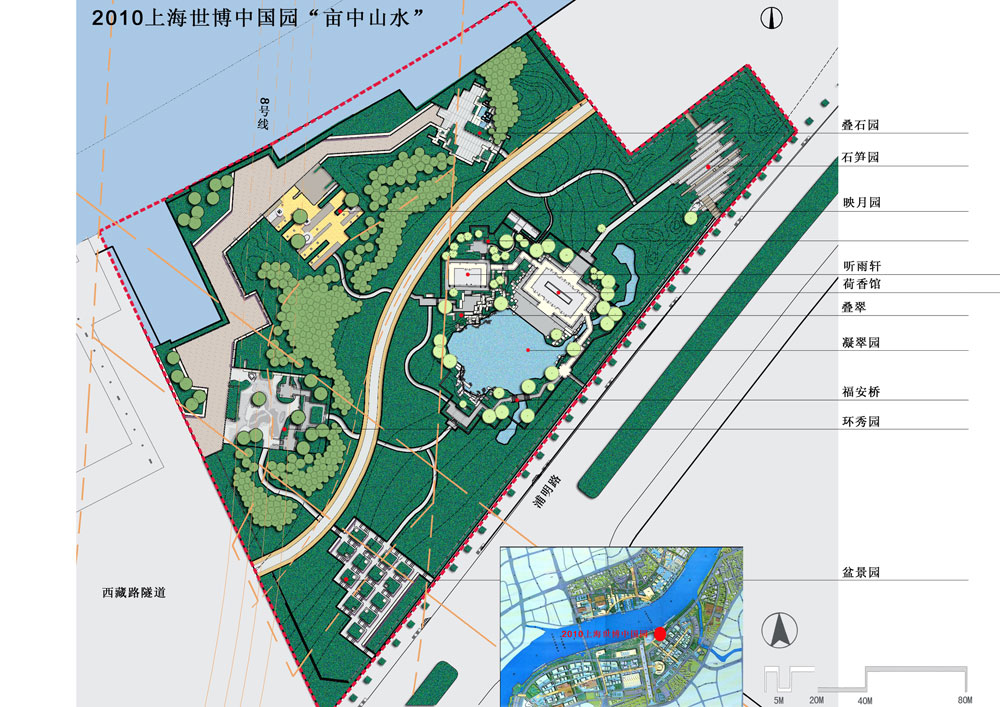中國2010年上海世博會薈集了世界各地的規劃、建筑園林設計、工程等成果,“中國園”是這個多元化的國際大展臺上體現傳統與現代相融合的中國園林的重要部分。占地面積約2.7公頃、位于黃浦江南岸、世博會演藝中心以東、浦明路北側水門廣場以西,在世博會期間是重要的人流聚集、停留、轉換的中轉站;在世博會后當大部分國家館被拆除后,中國園將與中國館等為數不多的場館存留下來作為會后文化遺產,繼續為上海市民服務。在世界全球化盛行的今天,如何在有限的用地上設計體現出即有中國文化內涵又充滿現代氣息的現代園林不僅是本項目的設計原則,也應成為當今景觀設計師的職業宗旨。