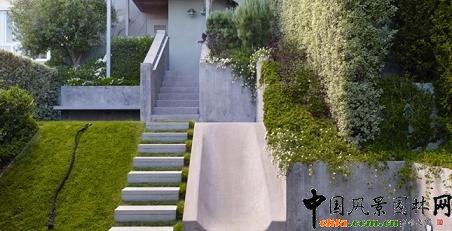 客戶的三層極簡派現代住宅位于舊金山布埃納維斯塔公園附近,在建筑屋頂甲板上可以看到廣闊的城市景象。當我們在2004年開始這個項目的時候,后院給人感覺空間尺度很小,具有陡峭的斜坡,不規則的角度,楔形的一片片雜。場地長44英尺,最寬處25英尺。在南邊,因其以沿街的城市擋土墻為界,任何階地都需要自己的扶壁支撐;在北邊可被周邊房屋看到的空間則需要一個高大的隔板。盡管這些障礙限制了空間的延伸,客戶依然決定要探索一些方法,使這塊地成為一個可供他們雙胞胎女兒使用的戶外活動空間,這樣他們就不用像以往那樣開車帶孩子們去操場或是讓孩子們在室內活動了。客戶同時也希望這個活動空間俯視效果也能同樣具有趣味性。