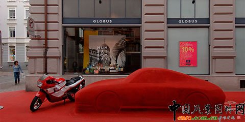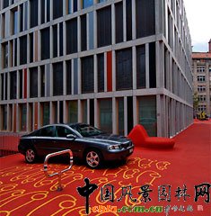 該項目打造了一個紅色“地毯”,鋪在周圍建筑之下!暗靥骸鄙鲜侨藗冃蓍e、交談的空間,這里有公園、噴泉,甚至一個轎車造型的紅色雕塑,如果你愿意,還可以爬上去。