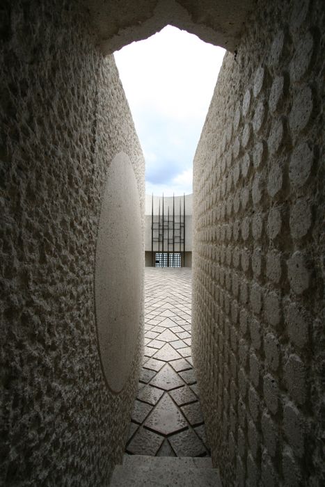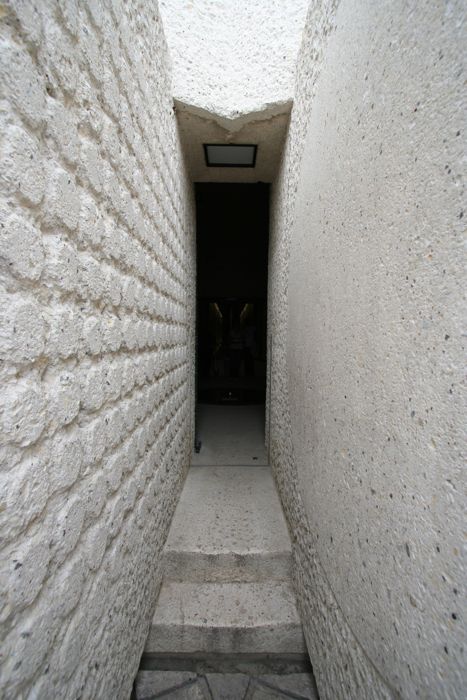 兩座樓梯中間夾著兩塊懸挑起來的巨石,巨石中間的豁口是紀念堂的唯一通道。紀念堂里面有一個主室和若干個配房。擠過通道我們來到紀念堂的主室,這是一個六邊形的封閉空間。墓室正中的地板上有一塊圓形的金屬牌匾,上面鐫刻著:"他們沉入了地球的嘴中,他們再也沒有回來"。金屬牌匾中心是一束搖曳不定的微弱孤燈,象征"永恒希望的火焰"。