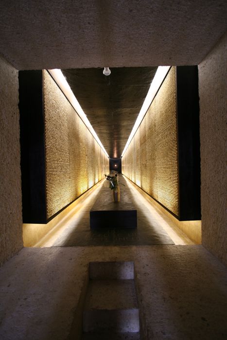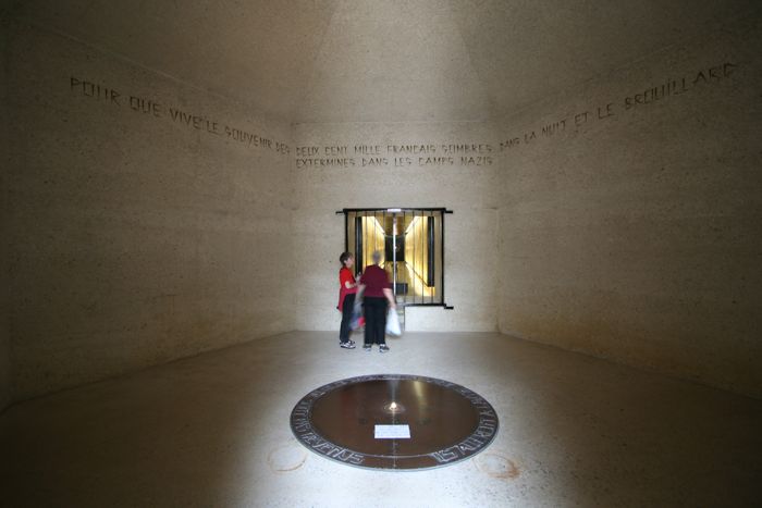主室前面是一個長長的走廊,狹窄墓道兩側的墻壁上點綴著20萬顆水晶,它們被光線照耀得通明,這就是被驅逐的無名者墓碑。墓碑上刻著“紀念沉睡于黑夜和迷霧中的20萬落難者,他們被驅逐出法國,最后在納粹集中營遭受迫害”。