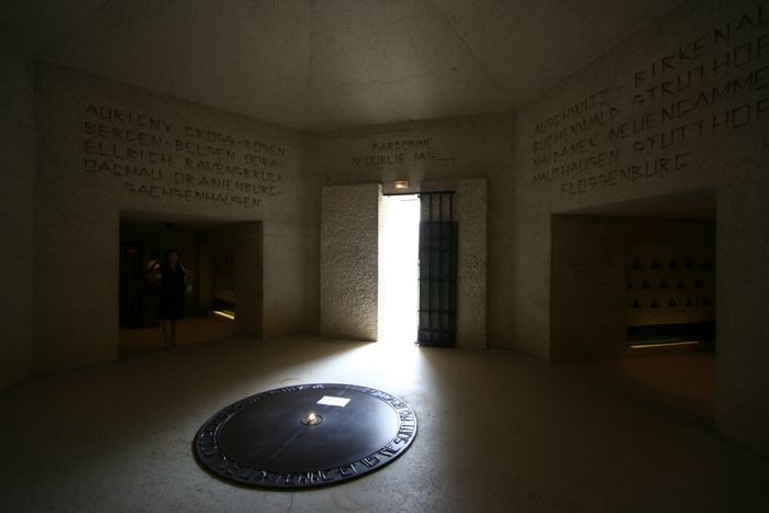 其中一側配房,墻上嵌入黑色三角形,刻有死亡集中營的名稱,并儲藏那里的土壤以及部分受害者的骨灰。墓室出口上刻著警句:“寬恕,但永不忘卻!”。這在所有紀念納粹迫害者的網站上都能見到的。