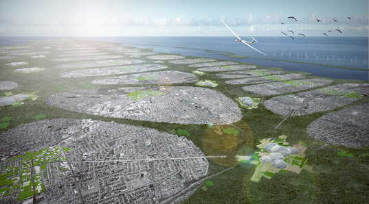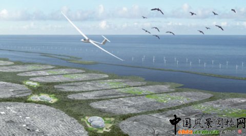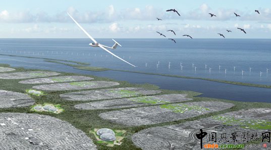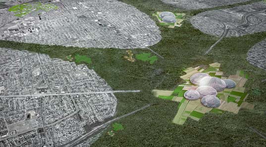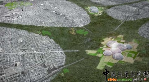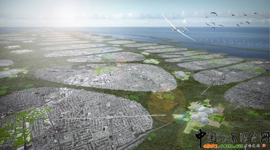上圖右下角所示的結構被稱之為“布基圓頂(Bucky Domes)”,代表著被玻璃密封的高密度水培農場,這個農場將負責整個長島的食品供應。風力農場位于近海岸,能夠很好的利用自然氣流。