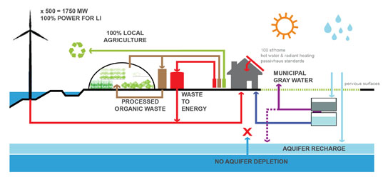 來自托比亞斯·奧萊(Tobias Holler)、凱特琳·馬爾里(Katelyn Mulry)、斯文·彼得斯(Sven Peters)和安娜·塞拉(Ana Serra)設計團隊提交了作品《長島的根本改造——重塑生命島(LIRR: Long Island Radically Rezoned - A Regenerative Vision for a Living Island)》,其中在社會發展與自然的關系、能源的再生利用、水、當地食物和高效的廢物處理方面的特別設計給人留下了深刻印象,《長島的根本改造——重塑生命島》也成為此次競賽中學生類的獲獎作品之一。