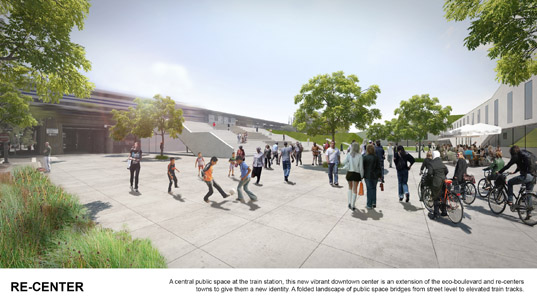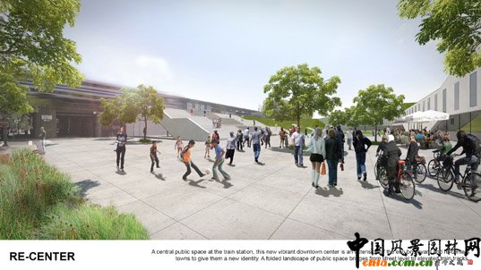 RE-CENTER:中央的公共區域位于火車站,一個充滿活力的郊區中心將成為景觀大道的延伸。將街道延伸到火車軌道的這個改造形成的折疊式景觀,將賦予社區一個全新的身份。