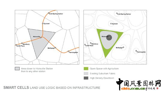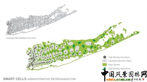 根據土地使用的條理性和現有基礎設施情況,長島的根本改造中的智能細胞將重點對區域的細分坐出調整。城市中心區域將更加緊密而有序,使得人為景觀得到更加高效的利用,城市周邊區域則保留出開放空間,為農業和棲息地的恢復保留提供場所。