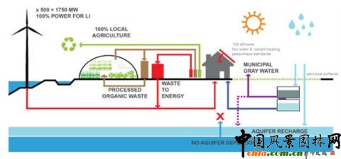 這個再生的生命島憑借自身可再生資源,以及那些被耗盡時能夠及時補充的有限資源,例如水來自雨水,電力來自風能,食物來自有機廢物分解后重新生成的堆肥,熱水來自太陽能,綠色開發空間來自建成區之間的空隙。