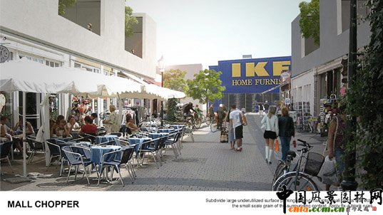 MALL CHOPPER:計劃細化商場周邊大量沒有充分利用的地面停車場,形成小尺度的周邊環境。