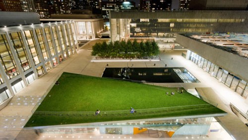海帕館坪只可從廣場進入,草坪面積為7200平方英尺,在兩個相對的角落隆起,而餐廳就夾在廣場和草坪層之間。草坪位于建筑之上,能遠離城市噪音和交通,形成一個城市田園之處。