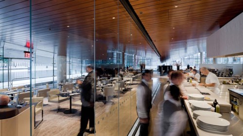 餐廳面積為11000平方英尺,有兩層,在第65號大街和赫斯特廣場分別設有入口。主餐區和廣場位于同一水平面,餐廳的透明立面設計讓用餐者和林肯中心的公共生活直接聯系在一起。。餐廳中間是一個1000平方英尺的廚房設計,正對著餐區。餐廳內設有休息區、吧臺區和私人用餐區,總共能容納194為客人。