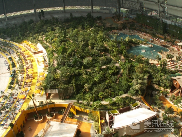 因此,機庫變成一個巨大的穹頂建筑。這里面隱藏著一個擁有合適的氣候、植被、濕度和度假的客人的熱帶海島度假勝地。這個海島的總面積為7萬平方米。