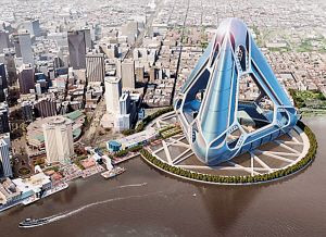 據美國媒體8日報道,美國新奧爾良市自從5年前慘遭“卡特里娜”颶風襲擊后,重建工程迄今仍在進行中。以華裔設計師許積遜為首的建筑設計師構思在密西西比河岸建造一座名為“新奧爾良生態建筑棲息地”的超級浮城。這座外形呈金字塔狀的“諾亞方舟”漂浮在水面上,可容納4萬人居住,外立面采用太陽能發電板覆蓋,可以利用風力和太陽能發電,能夠抵御超級颶風,即使世界末日來臨,也可以安然無恙。