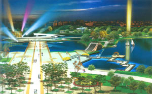 龍?zhí)?a href="http://design.m.kstxie.cn" target="_blank" title="規(guī)劃設(shè)計(jì)">公園設(shè)計(jì)強(qiáng)調(diào)各景區(qū)的內(nèi)在特色景觀和總體景觀的呼應(yīng)關(guān)系,景點(diǎn)以景觀秩序與文化情結(jié)的創(chuàng)作題材構(gòu)成,各景區(qū)布局注重現(xiàn)代景觀理論的綜合應(yīng)用,以不同的形式、不同的規(guī)模向游人展示一個(gè)全新的以2500年慶典為主題的生態(tài)文化休憩公園。在體現(xiàn)都市文化的基礎(chǔ)上,突出景觀情節(jié)的視覺空間與展示空間。 2.1特色景觀 (1)慶典廣場 作為全園的主景,以太原的“太”字作為構(gòu)圖原型,并且結(jié)合太原地區(qū)“打開靈石口,空出晉陽湖”這是流傳很久的古語,形成水中的慶典廣場,突出強(qiáng)勁的視覺景觀與園林生態(tài)文化景觀的感染力。 (2)城市季節(jié) 以都市樂章景區(qū)為城市季節(jié)的主體空間,營造出獨(dú)具太原文化特色的綜合室外文化展示區(qū),形成展示太原都市文化、民間文化、多題材景觀雕塑的室外布展中心,豐富全年的公園文化景觀特色。 (3)唐風(fēng) 在都市樂章景區(qū)中通過“唐風(fēng)”景點(diǎn),把太原最具特色的“唐”展示出來,它不僅是太原的“唐”,而且是全世界華人的“唐”,它既展示出唐朝的輝煌,更展示出唐人在全世界的影響。 (4)生態(tài)畫廊 公園的主水面以象征蓬萊、方丈、瀛洲的水中三島突出傳統(tǒng)生態(tài)氣氛,并結(jié)合濕地園營造出現(xiàn)代景觀氛圍。 2.2軸線、空間 龍?zhí)豆珗@在景觀布局上強(qiáng)調(diào)軸線與空間的特色,通過軸線轉(zhuǎn)折的方式,把主景區(qū)的景點(diǎn)巧妙地貫穿于景觀序列之中。空間的序列構(gòu)成更把不同題材的內(nèi)容融于各大景區(qū)之中。 (1)軸線 通過龍情、慶典廣場、唐風(fēng)使公園的主視覺軸得到貫穿統(tǒng)一。在這樣的軸線中,視覺軸成為公園的主要軸線內(nèi)容。在視覺的轉(zhuǎn)折中,把公園最具震撼力的景觀展示出來,并且強(qiáng)化了公園的主題內(nèi)容,以更為簡潔的手法,更有創(chuàng)作力的景觀品質(zhì),把主要景觀區(qū)推向高潮。 (2)空間 龍?zhí)豆珗@的各大景區(qū)空間,強(qiáng)調(diào)親情化的景觀內(nèi)容,把情感空間作為空間的主要組成內(nèi)容,在突出以文化為底蘊(yùn)的景區(qū)特色中,賦予各序列空間不同的情感與文化主題。這些極富親情化的情感空間,給游人以強(qiáng)烈的交流感受及零距離的空間感受。 3.景區(qū)劃分 龍?zhí)豆珗@設(shè)計(jì)充分利用原動(dòng)物園的自然條件,在保持水面與樹木現(xiàn)狀的同時(shí),運(yùn)用景觀序列組景構(gòu)成手法,在景區(qū)構(gòu)成上,體現(xiàn)秩序景觀的序列布局,在分區(qū)上體現(xiàn)不同主題思想的對比與統(tǒng)一。把景觀與人、都市文化、環(huán)境本身聯(lián)結(jié)起來,強(qiáng)調(diào)動(dòng)感空間與情感空間的相互融合。在景觀的序列布局中把“人”作為景觀創(chuàng)作的核心,在主題思想的展示中,更強(qiáng)調(diào)觀者在景觀構(gòu)成上的地位,其景觀構(gòu)成元素也圍繞著這樣的參與主題來完成。 公園規(guī)劃采取景觀語言的方式,展示出本創(chuàng)作的特殊魅力。以“龍·2500·唐”作為總創(chuàng)意骨架,以都市樂章、古韻風(fēng)華、生態(tài)畫廊和水上活動(dòng)區(qū)等4個(gè)景觀區(qū)為景觀主線,將城市與人,人與生態(tài)、休閑充分地融合于景觀設(shè)計(jì)中,既突出了濃重的建城2500年慶典氣氛,也體現(xiàn)了極強(qiáng)的地域文化特征。公園以都市樂章形成最具沖擊力的視覺景觀軸線,同古韻風(fēng)華、生態(tài)畫廊的動(dòng)態(tài)景觀形成強(qiáng)烈的對比,創(chuàng)作出最富有線形景觀魅力的、最具特色與風(fēng)情的以慶典為主題的生態(tài)文化休憩公園。 公園設(shè)4個(gè)入口,以新建路入口為公園的主入口,強(qiáng)調(diào)拉入式景觀,以軸線透景的方式將慶典廣場景觀對應(yīng)出來,并采取臨水臺(tái)階的方式形成親水性極強(qiáng)的內(nèi)容。城坊街入口作為進(jìn)入公園的景觀入口,強(qiáng)調(diào)與公園最具特色的視覺景觀軸的對比與呼應(yīng)關(guān)系,同唐風(fēng)景點(diǎn)形成地景藝術(shù)中的景觀互動(dòng)。公園南入口突出親切平和的視覺效果,同生態(tài)畫廊景區(qū)融為一體。公園北入口作為功能型入口。公園由以下景觀區(qū)構(gòu)成: (1)都市樂章景區(qū) 作為建城2500年慶典的主要景觀區(qū),以水中的慶典廣場作為該區(qū)最具魅力的特色主題,該景觀區(qū)通過軸線的變化,形成了公園的主要景觀線索。把“龍城”、“北都”和今日的輝煌融為一體。該景區(qū)由西入口、龍情、慶典廣場、唐風(fēng)、觀光溫室、景觀碼頭、遠(yuǎn)古的呼喚等景觀點(diǎn)構(gòu)成。 西入口 是同慶典廣場相對應(yīng)的景觀入口,該入口采取拉入式景觀的處理方式,把慶典廣場的景觀直接引向新建路,既豐富了城市街景,又把慶典的氣氛引入城市之中。 龍情 是為了突出龍城太原的景點(diǎn),通過9個(gè)不同龍的“地景”點(diǎn)綴于主入口廣場之上,形成濃重的景觀氛圍,烘托出龍城太原令人遐思的回憶,并且該景點(diǎn)作為走向慶典廣場的景觀引導(dǎo)。 ?wèi)c典廣場 是利用現(xiàn)狀龍?zhí)豆珗@北側(cè)湖面的小島而形成的