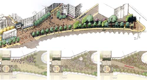3)功能的多樣化:作為中國城唯一公共空間,各方人士對其有不同的功能訴求,包括要求有更多的綠地以休閑、要求有更多的話動場地以滿足節日活動的需求、要求有體育場所滿足居民日常晨練的需要、要求有更好的形象滿足旅游的需求等。但場地面積十分有限,而且狹長,如何滿足各種功能的需要,是設計面臨的難題。