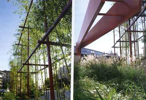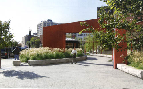 公園北端的紅色鋼板;界定中國城的北入口,與露絲·肯尼迪;綠道相連,茅草和紅色的鋼板形成強烈對比