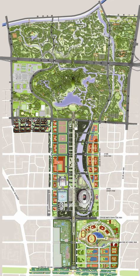北京奧林匹克公園總規(guī)劃圖 與歷屆奧運(yùn)會(huì)奧林匹克公園選址不同的是,北京城市的傳統(tǒng)中軸線(xiàn)將貫穿整個(gè)奧林匹克公園。北京城被稱(chēng)為人類(lèi)歷史上城市規(guī)劃與建設(shè)的杰作。天壇、天安門(mén)廣場(chǎng)、紫禁城、景山,貫穿了北京城中軸線(xiàn)的始終,氣勢(shì)磅礴,形成了城市建造史上最偉大的軸線(xiàn)。中國(guó)歷史上的大規(guī)模城市規(guī)劃多采用規(guī)則式棋盤(pán)狀布局,體現(xiàn)了對(duì)秩序的追求;而城市的園林部分多采用自然式空間格局,體現(xiàn)人與自然的和諧統(tǒng)一,表達(dá)了對(duì)自然的尊重。北京奧林匹克森林公園總體規(guī)劃在滿(mǎn)足奧運(yùn)會(huì)場(chǎng)館功能基礎(chǔ)上,給予北京城中軸線(xiàn)新的延伸——北部森林公園,將使這條舉世無(wú)雙的城市軸線(xiàn)完美地消融在自然山林之中。 2002年,北京市規(guī)委組織奧林匹克公園概念設(shè)計(jì)國(guó)際競(jìng)賽,美國(guó)景觀設(shè)計(jì)公司所做方案被選為中標(biāo)方案2003年11月奧林匹克森林公園與中心區(qū)景觀規(guī)劃設(shè)計(jì)方案征集活動(dòng)評(píng)選出A01、A02、A04 3個(gè)優(yōu)秀方案。A02號(hào)方案為清華規(guī)劃設(shè)計(jì)研究院與美國(guó)SASAKI公司合作的方案,主題為“通向自然的軸線(xiàn)”。2003年12月根據(jù)市規(guī)劃委[2003]943號(hào)文《關(guān)于奧運(yùn)森林公園及中心區(qū)景觀規(guī)劃設(shè)計(jì)方案征集工作請(qǐng)示批復(fù)》的精神,決定由北京清華城市規(guī)劃設(shè)計(jì)研究院以A02號(hào)方案為基礎(chǔ)進(jìn)行深化整合。2005年4月14日市規(guī)發(fā)[2005]400號(hào)《關(guān)于奧林匹克森林公園規(guī)劃設(shè)計(jì)方案審查意見(jiàn)的批復(fù)》批示原則上通過(guò)奧林匹克森林公園規(guī)劃設(shè)計(jì)方案。2005年9月21日,奧林匹克森林公園建設(shè)規(guī)劃環(huán)境影響評(píng)價(jià)報(bào)告送達(dá)專(zhuān)家評(píng)審。2005年10月27日,市委常委聽(tīng)取了森林公園規(guī)劃設(shè)計(jì)匯報(bào),原則上批準(zhǔn)了奧林匹克森林公園景觀規(guī)劃方案。
