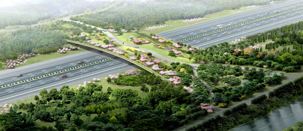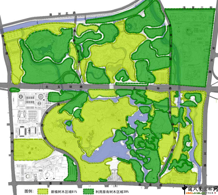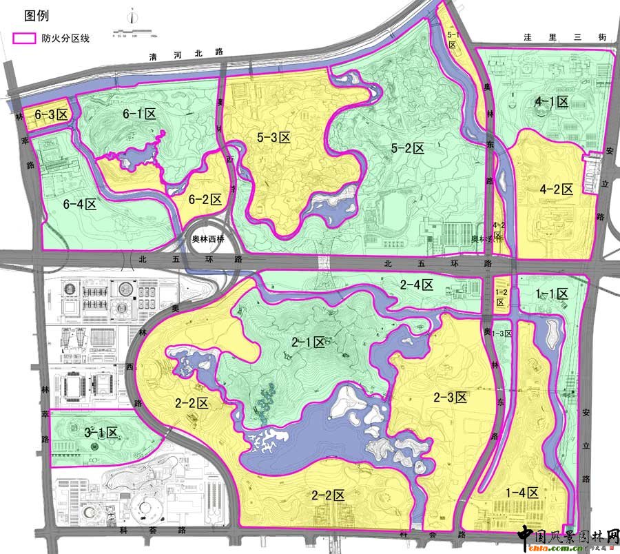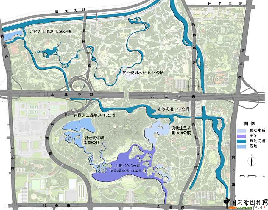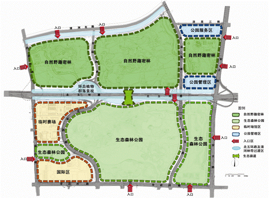 生態廊道鳥瞰圖 在如此規模的項目里全面應用各種最新的生態高科技技術,在中國目前的城市公園建設案例中是絕無僅有的,具有巨大的科技示范意義。本著“充分合理應用各種先進技術,因地制宜,節約投資”的原則,對生態廊道、全園雨洪綜合利用、固體廢物資源化——綠色垃圾循環處理、消防、生物多樣性對北京市環境影響、全園水質模擬及維護、人工湖湖底防滲漏處理、生態水處理溫室、生態建筑、綠色能源綜合利用、智能化管理、數字交通、照明、聲環境、廁所污水處理、智能化雷電預警、智能灌溉等各個專項進行了深入細致地研究,為該地區生態系統完善、功能使用、景觀與文化主題的確立制定出一系列指導性原則,科學地制定了施工與管理計劃,因地制宜,節約投資,體現“科技奧運”的宗旨。 公園規劃范圍:北至清河南側河上口線和洼里三街,南至辛店村路,東至安立路,西至白廟村路。被東西向穿過的北五環將其劃分成南北兩個區域。園內現狀主要有林地(405公頃)、湖泊(12公頃)、碧玉公園別墅區(7.83公頃)以及河道(渠)、農田、村莊、倉庫、工廠、歷史遺存等。用地內的村莊、倉庫和工廠做拆遷預備,碧玉公園別墅區少量保留,歷史遺存及已有的林地和水面盡量保留。奧運森林公園內共有文物古跡14處,其中包括石刻2塊、龍王廟1座。規劃將這些文物全部保留。 種群源地為物種“持久”生存的源地。森林公園位于溫榆河的支流清河南側,地處北京第一道綠化隔離帶中,有條件成為種群源地,通過河道、綠化帶與溫榆河種群源地聯系,使城市北部第一、二道綠化隔離帶形成良好的景觀生態體系結構。 森林公園由于現狀五環路的存在而自然地形成了南區與北區兩個部分,因此,根據這兩個部分與城市的關系及周邊用地性質、建設時間的不同,將二者分別規劃成以生態保護與恢復功能為主的北部生態種源地以及以休閑娛樂功能為主的南部公園區。 ![]() 奧林匹克森林公園防火分區圖 ![]() 奧林匹克森林公園豎向規劃設計圖 ![]() 奧林匹克森林公園全園植物利用分析圖 ![]() 奧林匹克森林公園水系規劃圖 以自然密林為主的北部公園將成為生態種源地,以生態保護和生態恢復功能為主,盡量保留現狀自然地貌、植被,形成微地形起伏及小型溪澗景觀。公園減少設施,限制游人數量,為動植物的生長、繁育創造良好環境。 南部定位為生態森林公園,以大型自然山水景觀的構建為主,山環水抱,創造自然、詩意、大氣的空間意境,兼顧群眾休閑娛樂功能,可設置各種服務設施和景觀景點,為市民百姓提供良好的生態休閑環境。重要景觀區有入口門區、主山景區、主湖景區、現狀森林區(原洼里公園、碧玉公園)、景觀濕地區等。構筑完善的功能結構體系,充實各項為人們服務的內容。