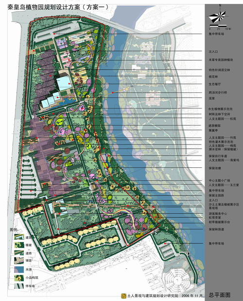 類別:城市公園與綠地 規(guī)模:30.65公頃 地點(diǎn):河北省秦皇島市 特色:植物園的發(fā)展是人類文明發(fā)展的標(biāo)志之一,與人類對植物資源的開發(fā)、利用和保護(hù)密切相關(guān)。它是進(jìn)行科學(xué)普及教育、提高民眾文化素養(yǎng),以及旅游和休憩的最好場所。我國有為數(shù)不少的植物園,但從質(zhì)上衡量,我國植物園與發(fā)達(dá)國家、甚至一些發(fā)展中國家的植物園相比都存在很大的差距。如何能夠建設(shè)一個具有當(dāng)?shù)靥厣朔F(xiàn)有植物園存在部分問題,形成設(shè)計(jì)的獨(dú)特之處,是設(shè)計(jì)中面臨的重大挑戰(zhàn)。而從當(dāng)?shù)噩F(xiàn)狀分析秦皇島植物園是秦皇島當(dāng)?shù)匚ㄒ坏闹参飯@,其設(shè)計(jì)出現(xiàn)填補(bǔ)了秦皇島市的空白,成為對市民進(jìn)行科普教育的重要基地。在城市生態(tài)層面上,該項(xiàng)目的地址選擇在湯河西岸,是整個湯河生態(tài)廊道的重要一個環(huán)節(jié)。設(shè)計(jì)這樣一個具有獨(dú)特價(jià)值的植物園,重點(diǎn)是如何能夠展示植物園的特色,體現(xiàn)生態(tài)的精神。設(shè)計(jì)中通過豐富新穎的設(shè)計(jì)手法,擺脫傳統(tǒng)植物園的分區(qū)展示模式,從而形成了一套有特色的植物展示方式包括了以下三大特色: 1、生態(tài)因子展示:土壤、水份、日照和溫度因子 2、生境再造:展示當(dāng)?shù)厣持械湫偷挠刑厣纳降亍⑵皆蜑l水生境,再造城市中的生境,展示城市-人文-自然的相互關(guān)系 3、特色專類展示:獨(dú)特的植物泡泡展示形式