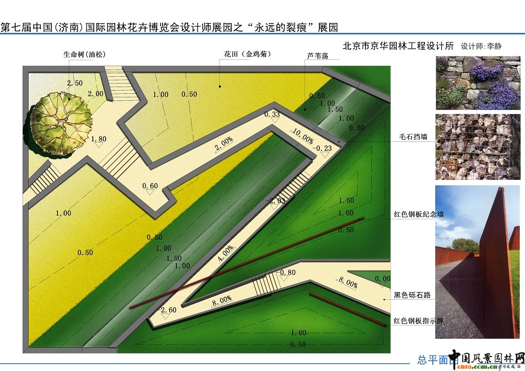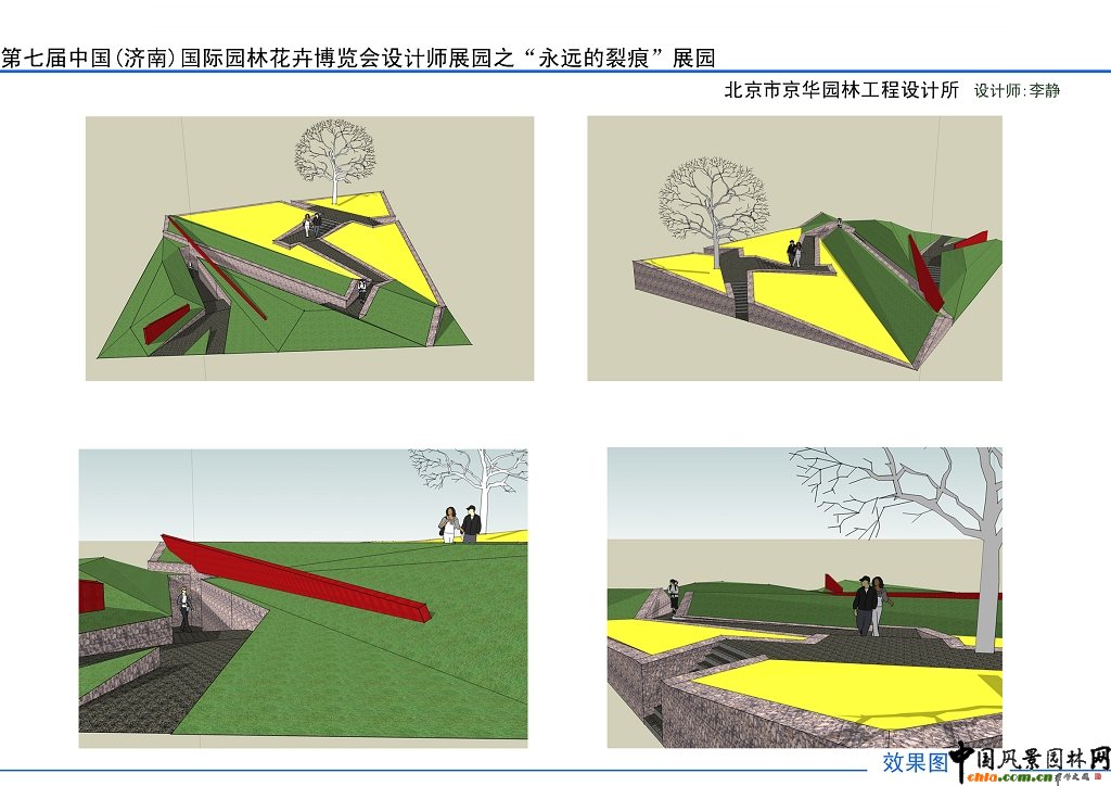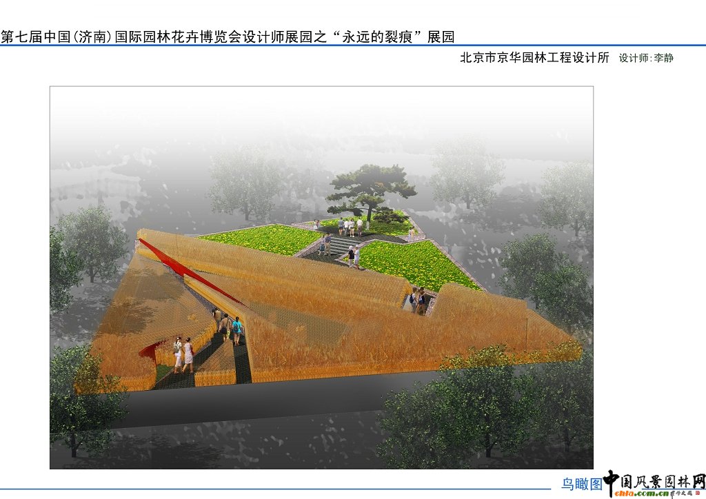 中國風景園林網(wǎng)訊 2009年2月,第七屆園博會組委會辦公室通過中國風景園林網(wǎng)向全國公開征集園博園國際展區(qū)設計師園8個展園的設計方案,截止2月底,共收到49份設計方案。2009年3月27日,第七屆園博會指導協(xié)辦組專家在濟南對設計師園的49份設計方案進行了評審。 本次評審遵循公平、公正的原則,密封方案設計者姓名、單位,按隨機編號順序評審。專家們對各設計方案的主題、創(chuàng)意、展園布局、景觀效果、生態(tài)體現(xiàn)及新材料、新技術應用等進行了詳細、認真的評審,共評選出優(yōu)勝獎8名、優(yōu)秀獎8名、鼓勵獎10名。以下是鼓勵獎方案--“永遠的裂痕”展示。 ![]() ![]() ![]() ![]()