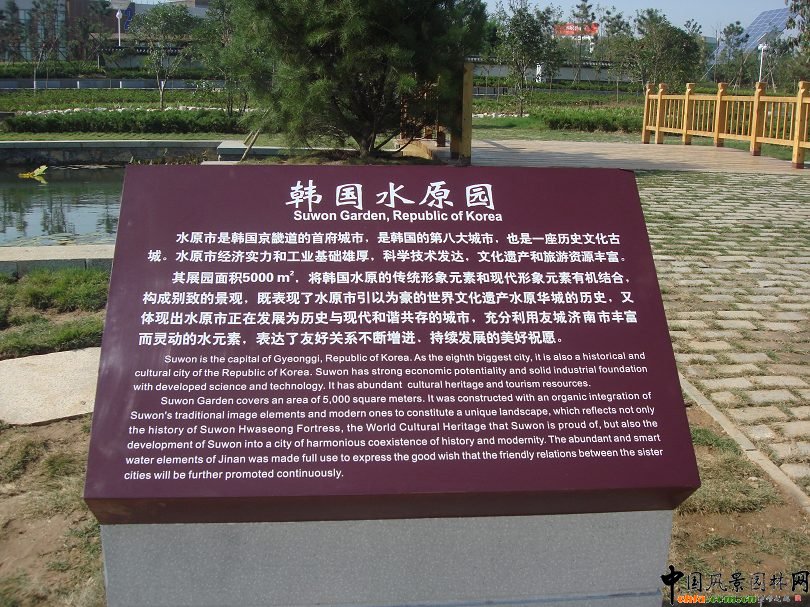 水原園占地面積5000平方米,將韓國水原的傳統形象元素和現代形象元素有機結合在一起,構成別致的景觀,表現了水原市引以為豪的世界文化遺產水原華城的歷史風貌。