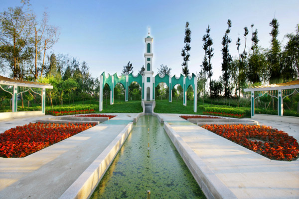 展園簡介:寧夏園占地面積1000平方米,展園借鑒伊斯蘭園林的規(guī)則式布局,以具有回族特色的邦克樓和景廊為主景,以十字型水景為軸線,以花架、噴泉為配景,以檉柳、沙棗、枸杞、金葉蕕、互葉醉魚草等沙旱生植物為主進(jìn)行植物造景,展示出“塞上江南,回鄉(xiāng)風(fēng)情”的地域特色景觀。