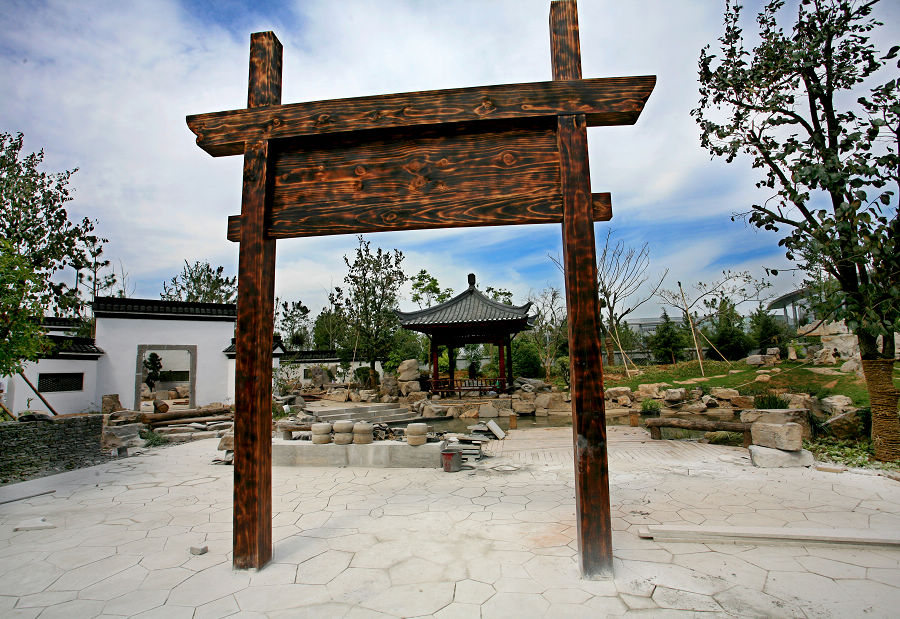蝶園的主題形象,是粉墻黛瓦的水鄉民居。而且融入了中國四大傳說之一的《梁山伯與祝英臺》。把感人肺腑的曲折故事,用四個重點情節予以表現:草橋結識,三載同窗,十八相送,蝶戀永伴。這就像妙筆生花一樣,讓山水與人、自然與文化,和諧地調和在一起。大家再看環水池周邊的綠地,那些低矮的小灌木、球形植物、花灌木、宿根花卉、水生花卉等等,塑造了一個清新宜人的典型環境。特別是院落與湖泊交接處的高大喬木,作為背景,掩映著古色古香的圓洞門和小門樓,在小提琴曲的渲染下,仿佛再現了萬松書院和梁祝書房里,梁山伯與祝英臺的柔情蜜意。