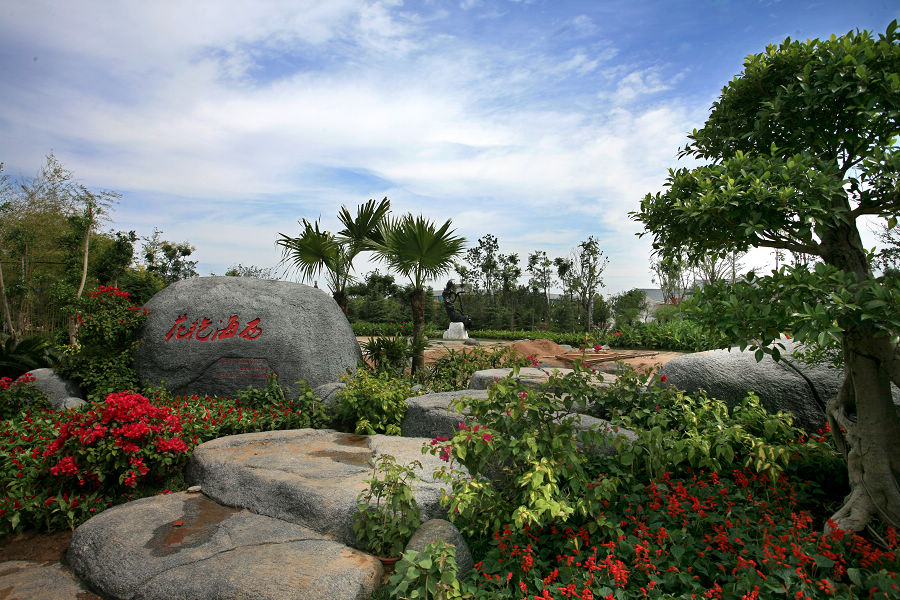 凌波仙子雕塑,是福建景園的核心。圍繞凌波仙子四周的是,福建的特色觀賞花卉:水仙、建蘭、榕樹、蘇鐵、三角梅、觀賞竹、赫蕉、扶桑、龍船花等。同時有大海,礁石和沙灘。用雄強襯托著芳香花影。再加上這波濤起伏的效果,又用動態映襯了凝重和雅靜。福建沿海地區的風土風貌,在這里得到了藝術化的表現。恰到好處體現了福建景園的主題:花艷海西。