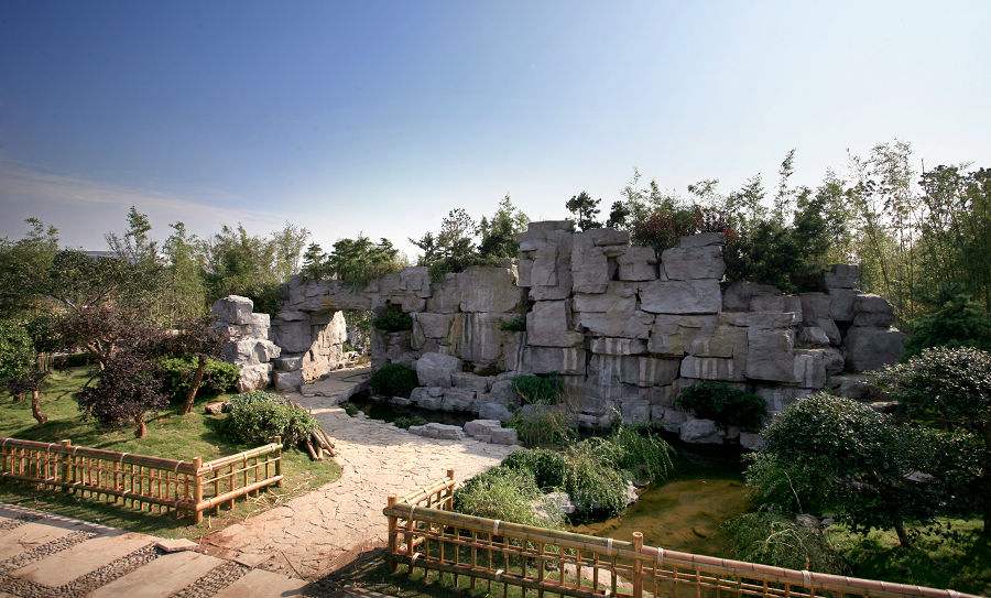 湖南景園,最醒目的是這個別具韻致的山居。山門石壁上的“問津”二字,為游人帶來了幾分神秘感。遠遠望去,奇峰回環,綠樹如云,小溪流水淙淙,兩岸野花爛漫。武陵源的峻山、奇峰、秀水、幽峽,在這里得到了直接展現。在仙境一般的田園風光中,淳樸的土家族吊腳樓,依山傍水,卓然而立。湖南景園用形象語匯,向人訴說了他們主題:“田園.向往”。